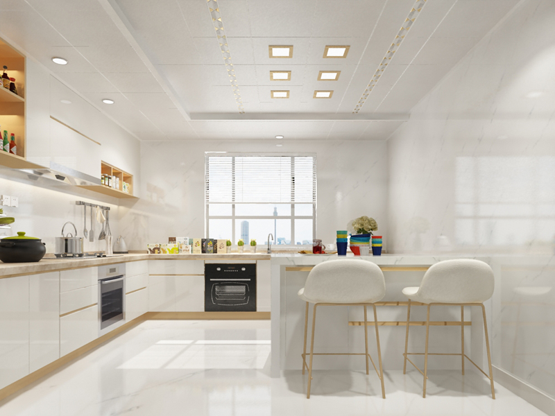 设计理念:敞亮的餐厨空间搭配优雅皓白的灯光,高贵而低调奢华的金属色调,大胆而活跃的搭配,依照厨房空间勾勒的错层吊顶空间,交相呼应,别致的质感给人带来时尚而现代的体验。